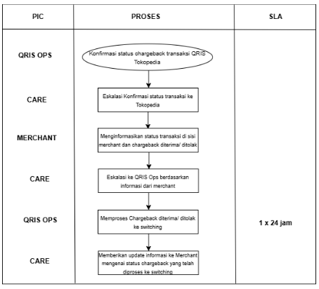 Agent Care melakukan eskalasi ke Tim QRIS Ops mengenai status transaksi sesuai informasi dari sisi Merchant beserta status chargeback, apakah diterima atau ditolak sesuai dengan update informasi dari sisi merchant